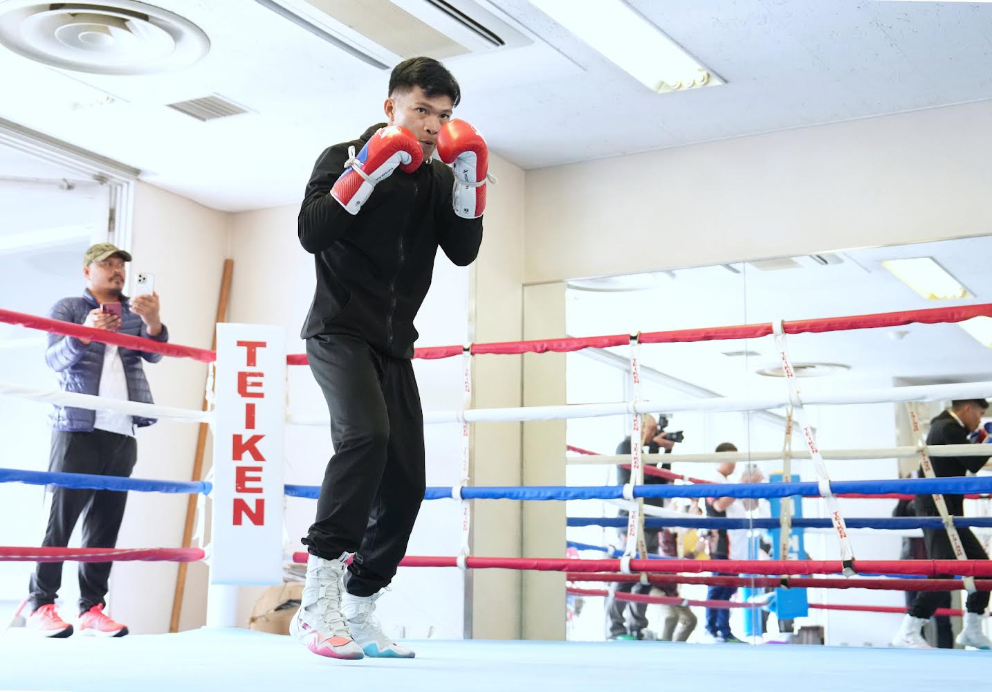 The Filipino will challenge the Japanese in a 118-pound bout and is already on Japanese soil. His first official activity was this workout, where he was with his team doing some moves, posing for the cameras and answering questions to the press.