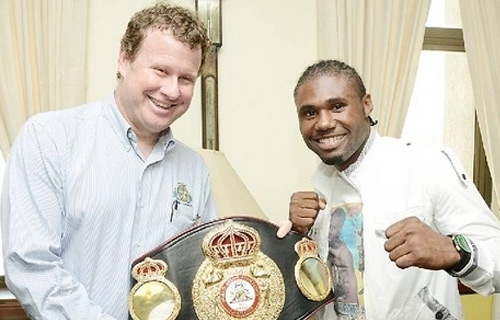Newly crowned World Boxing Association featherweight champion, Nicholas Walters (right), with managing director of J. Wray & Nephew, Paul Henriques, at the J. Wray & Nephew head office, Spanish Town Road, during the boxer’s road tour on Monday afternoon. – Contributed