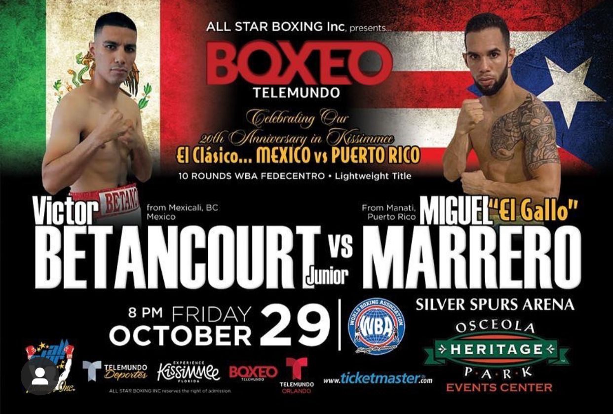 Mexican Victor Betancourt and Puerto Rican Miguel Angel Marrero will fight for the vacant WBA Fedecentro lightweight title on Friday at the Silver Spurs Arena in Kissimmee, Florida.