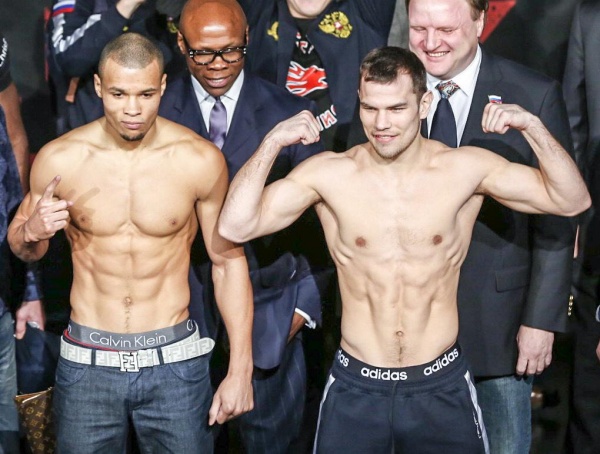 Russian Dmitry Chudinov, World Boxing Association 160 lbs Middleweight interim champion, and his challenger, Britain’s Chris Eubank are in weight for the battle of this Saturday at the O2 Arena in Greenwich, London, England.