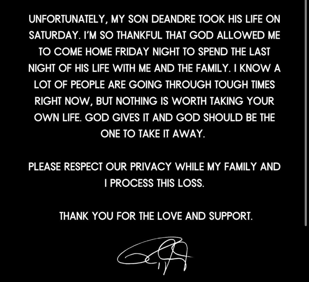 “Unfortunately, my son DeAndre took his life on Saturday. I’m so thankful that God allowed me to come home Friday night to spend the last night of his life with me and the family.”” Jones said in his statement.