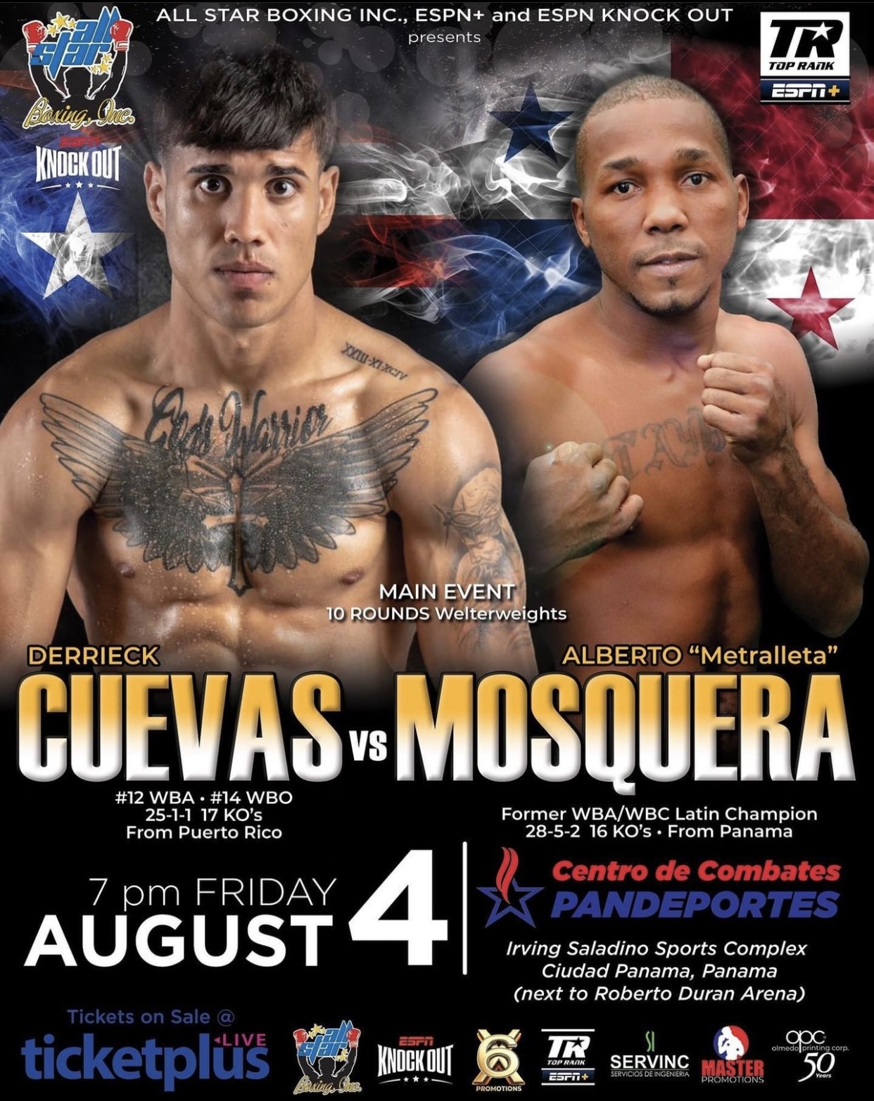 Puerto Rican Derrieck Cuevas, ranked 12 by the World Boxing Association (WBA), will return to Panama to face veteran Alberto Mosquera on August 4 at the Coliseo de Combates in the country’s capital.