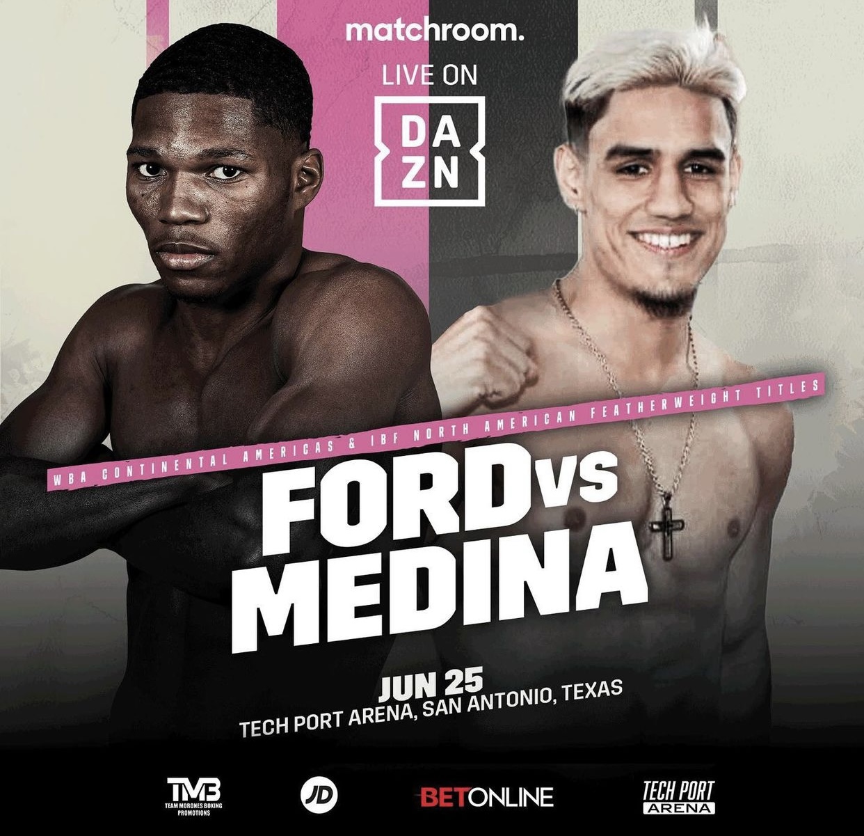 Ford has 13 wins, no losses, 1 draw and 6 knockouts. Medina, on the other hand, has 11 wins and 7 knockouts.