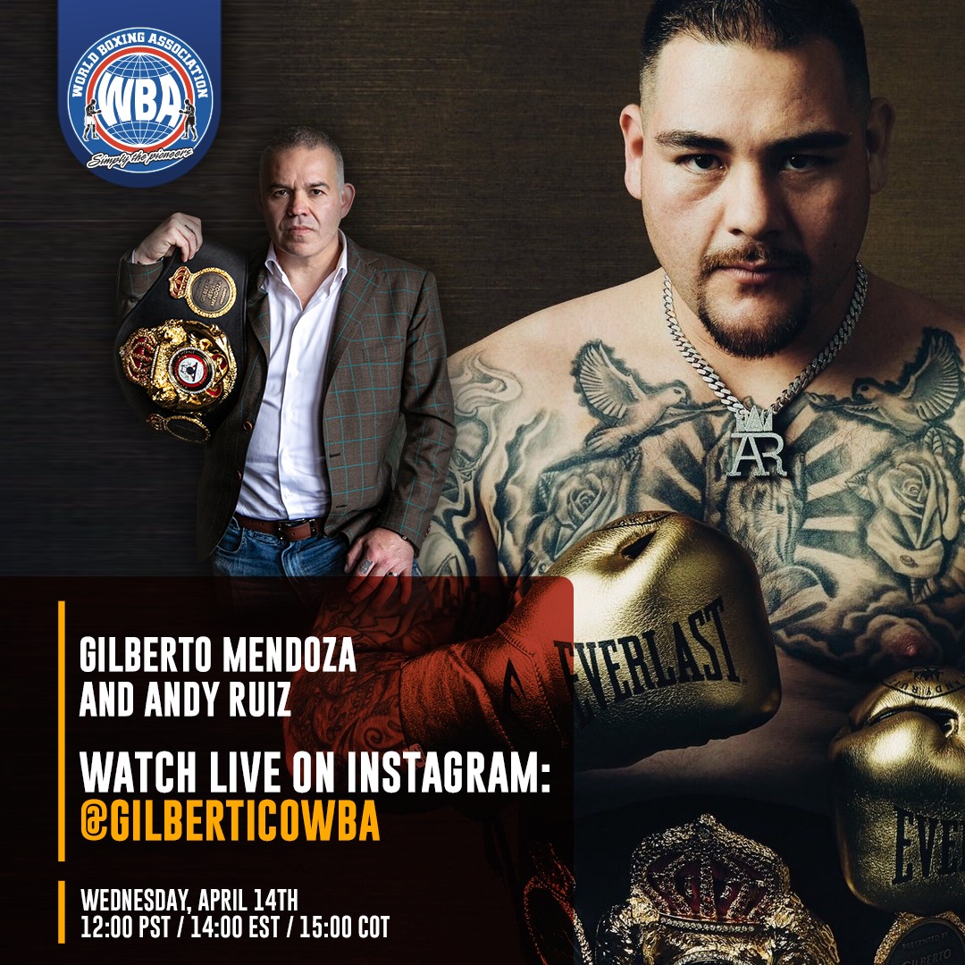 World Boxing Association (WBA) President, Gilberto Jesús Mendoza, will have a pleasant conversation with former WBA Super Champion Andy Ruiz on Wednesday at 12:00 pm Pacific Time and 2:00 pm Colombia Time through Instagram Live on their personal accounts @GilberticoWBA and @Andy_destroyer13.