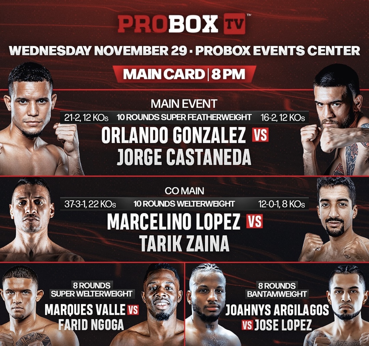 Gonzalez has a record of 21 wins, 2 losses and 12 knockouts, while Castañeda has 16 wins, 2 setbacks and 12 knockouts.