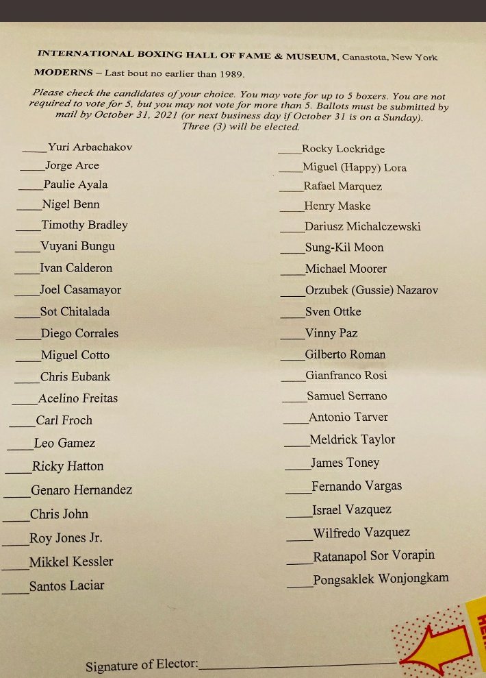 Miguel Cotto, Chris John, Diego “Chico” Corrales, Ricky Hatton, Joel Casamayor, Ivan Calderon, Antonio Tarver, Meldrick Taylor, Chris Eubank, Rafael Marque, Miguel “Happy” Lora, Leo “Torito” Gamez, Acelino Freitas, Carl Froch, Vinny Paz, Wilfredo Vazquez, Roy Jones Jr., Timoteo Bradley, Jorge “Travieso” Arce, among others, are on the list and the specialists will be in charge of casting the votes.
