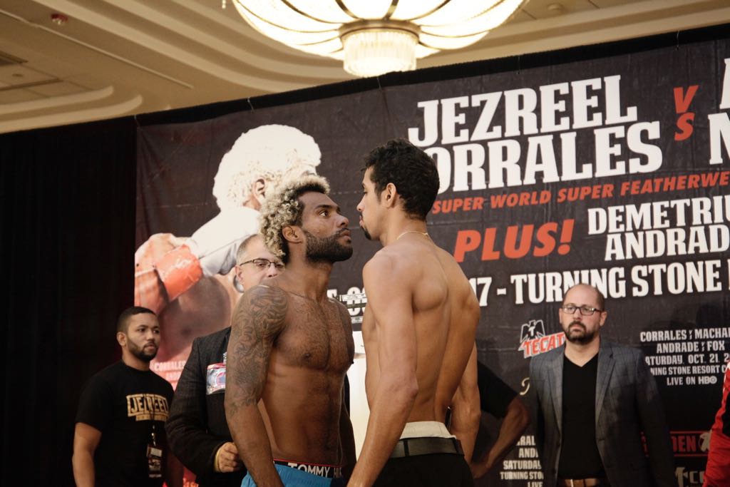Jezreel Corrales (22-1, 8KO’s) came in heavy at 133.25lbs at today’s weigh in in Verona, New York. Alberto Machado (18-0, 15KO’s) made weight at the super featherweight limit of 130.0lbs.