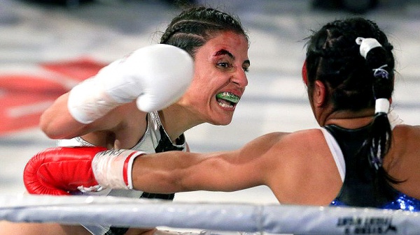 Fighting out of the red corner, Kentikian showed some ring rust after 11 months of inactivity due to issues with her former promoter. An accidental headbutt early in round two drew first blood from above her right eye. Despite the ministrations of her cutman between rounds, the blood was a distraction.