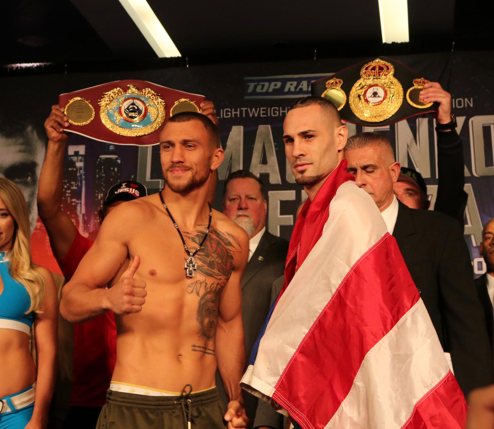 World Boxing Association super lightweight champion Vasyl Lomachenko and challenger for Saturday at Madison Square Garden in New York, Jose Pedraza, had no problems this Friday at the weigh-in ceremony. Both came in under the limit with the champion making 134.4 pounds and the challenger 132.2 pounds.