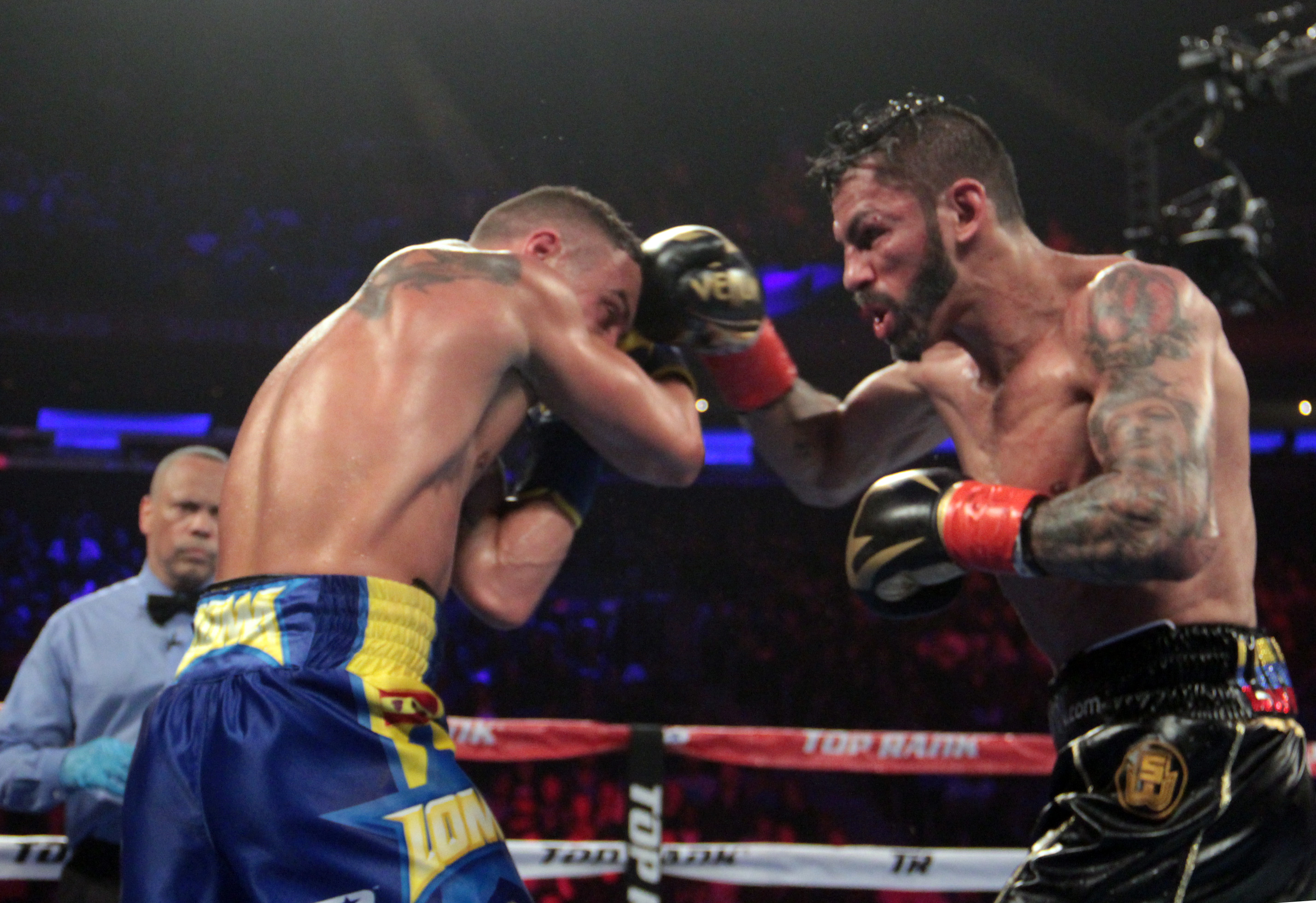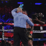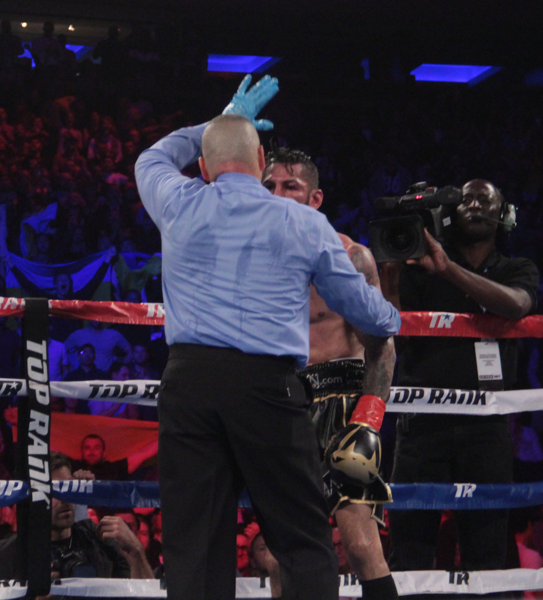 Linares rose off the canvas, beating the ten count, but referee Ricky Gonzalez called a halt to the bout when he deemed Linares unable to continue as he was still in pain from the body shot.