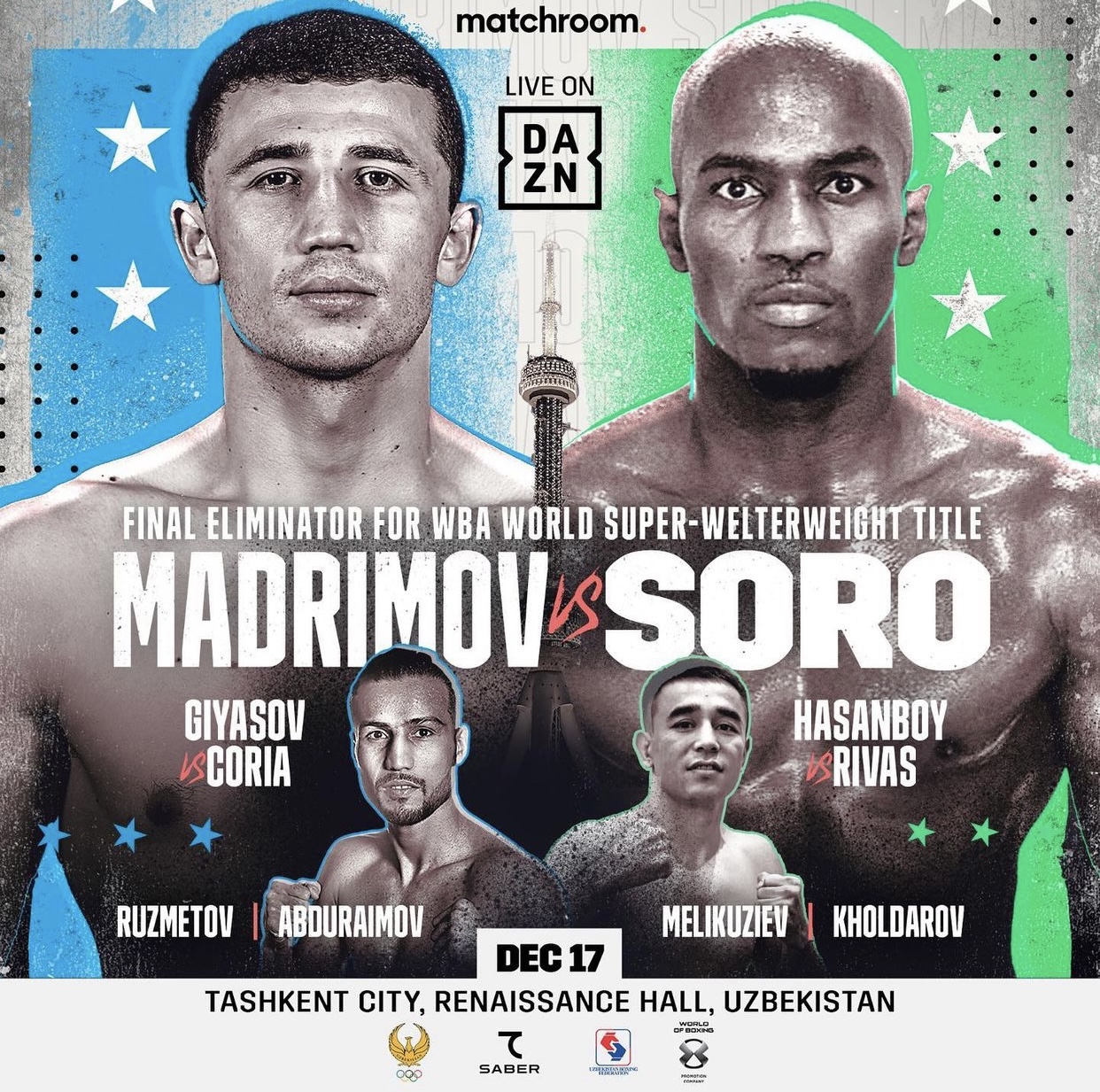 Israil Madrimov and Michel Soro will fight next Friday, December 17 in a World Boxing Association (WBA) super welterweight eliminator fight at the Renaissance Hall in the city of Tashkent, Uzbekistan.