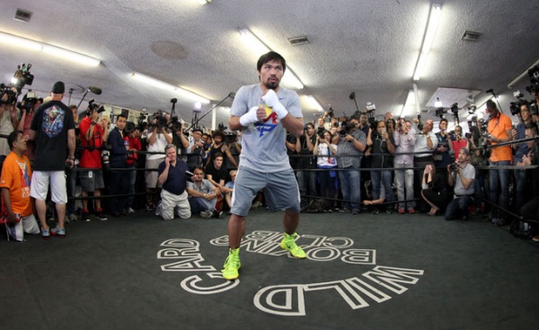 Eight division world champion and current WBO welterweight champion Filipino icon Manny “Pacman” Pacquiao (57-5-2, 38 KOs) held a media workout Wednesday afternoon at the Wild Card Gym in Hollywood, California as he gears up for his showdown with current pound for pound king Floyd “Money” Mayweather Jr. (47-0, 26 KOs). Pacquiao will face Mayweather Saturday May 2 at the MGM Grand Garden Arena in Las Vegas live on HBO/Showtime Pay per view.