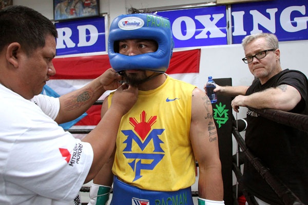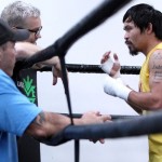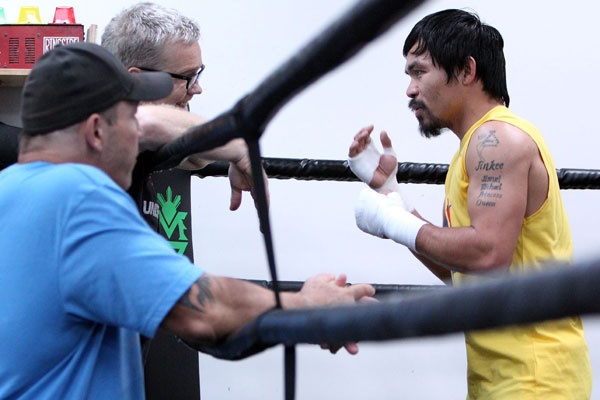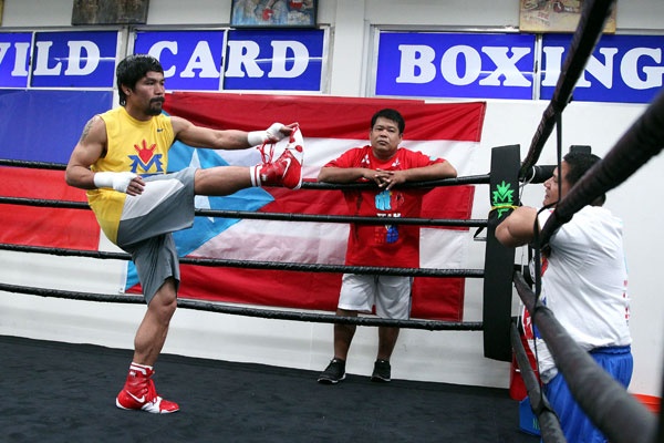 Superstar Manny Pacquiao trains with Hall of Fame trainer Freddie Roach and strength coach Justin Fortune for his upcoming 12-round welterweight world championship unification mega-fight against Floyd Mayweather.