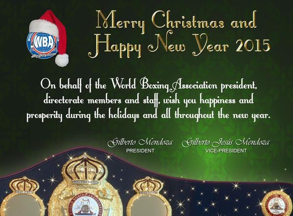 Merry Christmas and Happy New Year 2015 On behalf of the World Boxing Association president, directorate members and staff, wish you happiness and prosperity during the holidays and all throughout the new year. Gilberto Mendoza – President Gilberto Jesús Mendoza – Vice-president Share this: Click to share on Facebook (Opens in new window) Facebook Click to share on X (Opens in new window) X