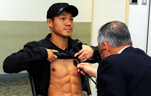 El japonés Koki Kameda, campeón mundial gallo de la Asociación Mundial de Boxeo, y su retador tailandés Panomroonglek Kaiyanghadaogym cumplieron hoy con el examen médico previo a su combate del próximo domingo 7 de abril en el Bodymaker Colosseum de Osaka, Japón.