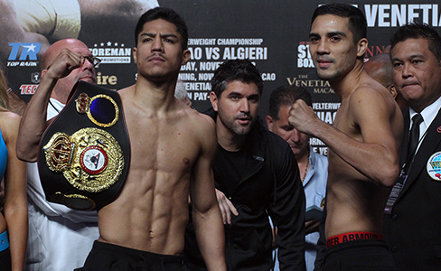 Jessie Vargas of the U.S. (L) and Antonio DeMarco of Mexico pose during official weigh-in for their World Boxing Association (WBA) super lightweight title fight in Macau November 22, 2014.