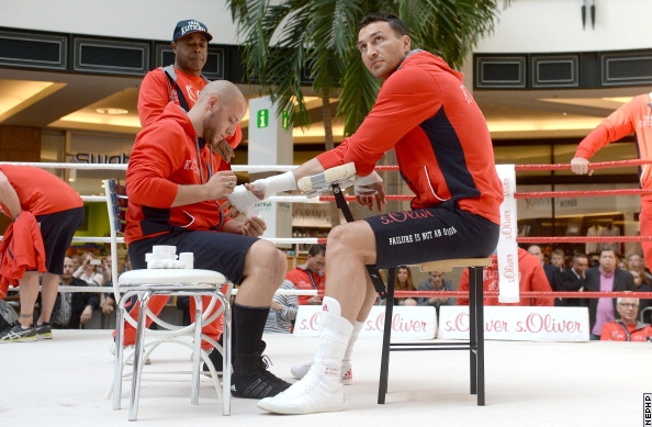 Wladimir Klitschko and Alex Leapai held their open workout at the Centro shopping centre in Oberhausen (Germany). About 3000 fans showed up to watch both fighters showing off their boxing skills in preparation for their heavyweight championship fight this Saturday, April 26. IBF, WBA, WBO, IBO and “Ring Magazine” Champion Klitschko and his contender Alex Leapai will face off at the König-Pilsener-Arena Oberhausen, Germany.