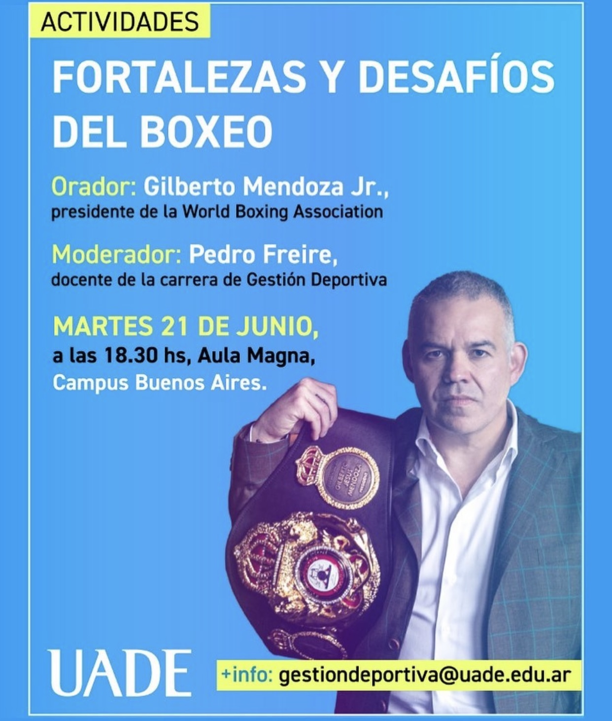 The president of the World Boxing Association (WBA), Gilberto Jesús Mendoza, will be a speaker at the talk “Strengths and Challenges of Boxing”, to be held on Tuesday, June 21 at the Argentine Business University (Universidad Argentina de la Empresa – UADE), at its campus in Buenos Aires.