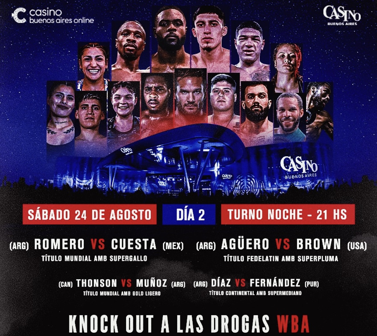 The World Boxing Association (WBA) will return to Argentina for a new KO a las Drogas, where two events will take place, one on Friday, August 23 and Saturday, August 24 at the Casino de Buenos Aires.