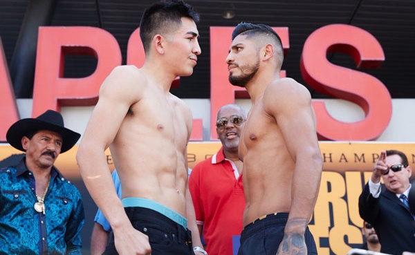 Leo Santa Cruz 124.8 vs. Abner Mares 125.2 Vacant WBA Featherweight Super Championship Santa Cruz and Mares make weight. Photos Suzanne Teresa/Premier Boxing Champions Share this: Click to share on Facebook (Opens in new window) Facebook Click to share on X (Opens in new window) X