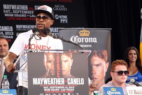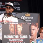Canelo raised his game in the city that Mayweather calls his ‘second hometown’ by pairing a grey v-neck shirt with black corduroy pants, stylish shades and shiny black shoes. Mayweather, whom Richard Schaefer labeled a trendsetter in “fashion, style and show biz,” sported a custom T-shirt with the words Money, Power and Respect on the front and his pre-Guerrero ring record of 43-0 spelled out in Roman numbers.