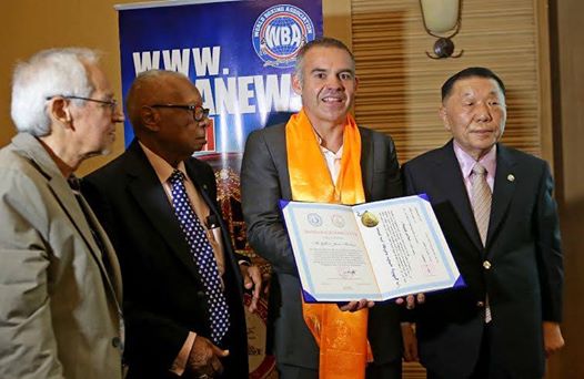 Universidad de Mongolia concede Doctorado a Gilberto Jesús MendozaIn the first date of meetings of the Executive Committee of the World Boxing Association, the regional Director and president of the WBA PABA, Yang Sup Shim, presented an honorary doctorate to Vice President Gilberto Jesus Mendoza.