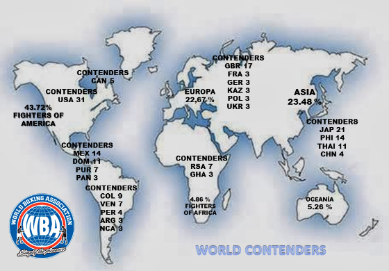 Thailand, Dominican Republic and Australia have 11 rated boxers each. There are also 9 Colombians and Venezuela, South Africa and Puerto Rico 7 boxers each.