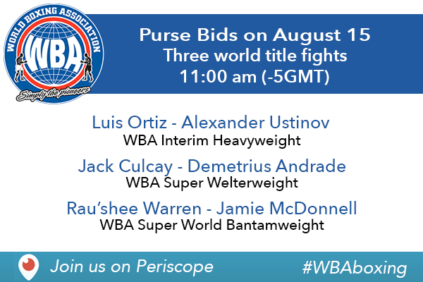 World Boxing Association president Gilberto Jesus Mendoza has written to “ALL BONAFIDE PROMOTERS” to inform them that purse bids for the following three WBA world title fights will be accepted on Monday, August 15, 2016.