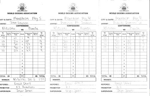 WBA Reports and official mastercards of Wladimir Klitschko vs Francesco Pianeta by the WBA supervisor of the fight Jesper Jensen. WBA Super World heavyweight title.
