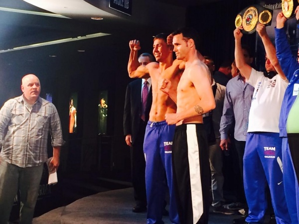 Golovkin (29-0, 26KOs) came in at 159.8 lb. for the 11th defense of his middeweight title. Geale (30-2, 16KOs), a former middleweight titlist, was slightly lighter at 159.2 lb.