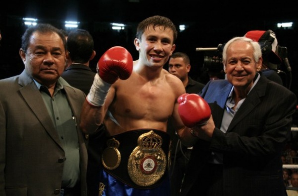 Gennady Golovkin campeón mundial medio AMB con el presidente emérito Gilberto Mendoza y el director de Clasificaciones mundiales de la AMB Miguel Prado