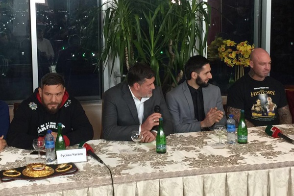 Ruslan Chagaev y Lucas Browne se vieron las caras este miércoles en la rueda de prensa previa al combate que se realizará en el Colesseum Sport Hall de Grozni, por el título de los pesos pesados de la Asociación Mundial de Boxeo (AMB).