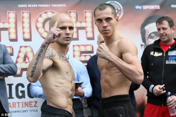 El monarca súper gallo, Scott Quigg pesó 121.8 libras y defenderá su corona ante el español Kiko Martínez quien detuvo la balanza en 121.5 libras.