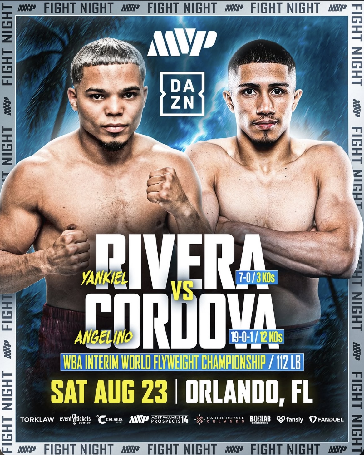 Este sábado 23 de agosto, en el Caribe Royale Resort de Orlando, Florida, el venezolano Angelino Córdova y el puertorriqueño Yankiel Rivera se enfrentarán por el título mundial interino de peso mosca de la Asociación Mundial de Boxeo (WBA).