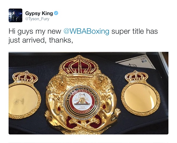 “Hola chicos, mi nuevo cinturón de la Asociación Mundial de Boxeo acaba de llegar. Gracias” escribió el británico en su cuenta twitter @Tyson_fury.
