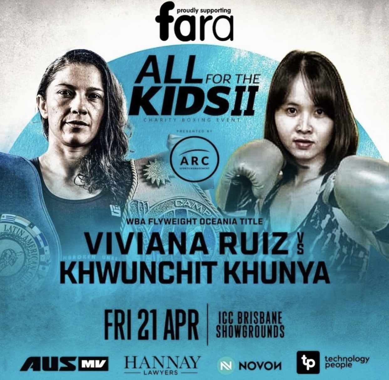 En una nueva presentación internacional, la boxeadora de Bogotá radicada en Australia Viviana Ruiz, se presentará este viernes 21 de abril en el Royal International Convention Centre de la ciudad de Bowen Hills, Queensland, Australia, para intentar adueñarse de la faja regional de Oceanía de la Asociación Mundial de Boxeo en la categoría mosca frente a la tailandesa Khwunchit Khunya.
