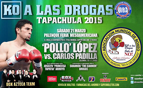 Chiapa’s Emanuel “Pollo” Lopez will fight the Colombian Carlos “Batey” Padilla for the World Boxing Association (WBA) Super Featherweight Interim Championship Zanfer Promotion on March 21 boxing program as part of the successful “WBA KO Drugs” Campaign carried out by the World Boxing Association, in Tapachula, Chiapas, Mexico.