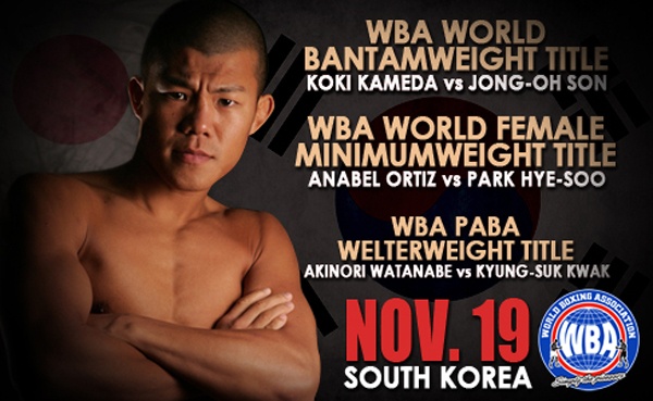 WBA Bantam Weight Title Match at Jeju Grand Hotel Nov 19th WBA WORLD BANTAMWEIGHT TITLE KOKI KAMEDA vs JONG-OH SON WBA WORLD FEMALE MINIMUMWEIGHT TITLE ANABEL ORTIZ vs PARK HYE-SOO WBA PABA WELTERWEIGHT TITLE AKINORI WATANABE vs KYUNG-SUK KWAK Share this: Click to share on Facebook (Opens in new window) Facebook Click to share on X (Opens in new window) X