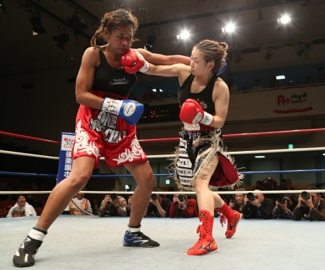 Ayaka Miyao-Onesongchai foto by Boxing BeatWBA light-minimum weight titlist Ayaka Miyao (13-1, 2 KOs), 102, also kept her belt when she displayed her sharpness and strength against a cute and lanky Thalander Buangern Onesongchaigym (10-5-1, 1 KO), 102, to finish her for the count at 1:30 of the fifth session. Having defeated official challenger Getchen Abaniel in her previous defense, Miyao, making her fourth defense, proved she gained more power than previously and battered the game challenger from all angles to effectively hurt her. But the good loser Buangern, still 21, looked promising despite her well-praised defeat.